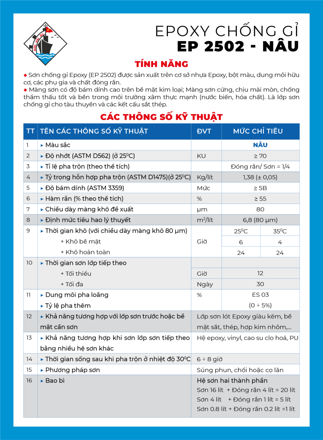 - Sơn chống gỉ Epoxy (EP 2502) được sản xuất trên cơ sở nhựa Epoxy, bột màu, dung môi hữu cơ, các phụ gia và chất đóng rắn.